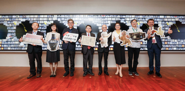 友達攜手創利空間為故宮建置的智慧文物互動導覽牆及輪播牆,今日正式啟用 (左四:友達新事業暨投資管理總部副總經理楊本豫、右四:國立故宮博物院院長吳密察、右三:太極影音董事長黃寶雲)